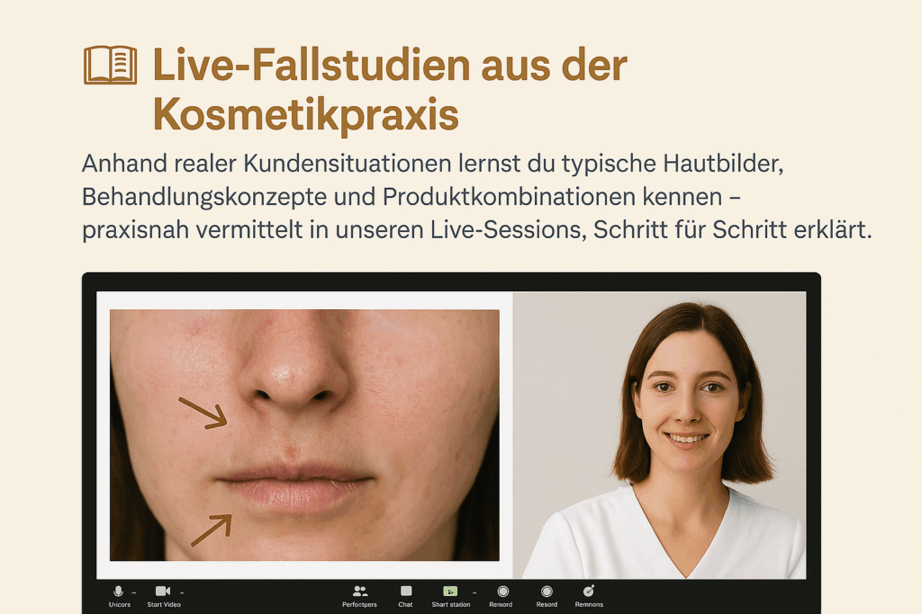 Lerne, Hautzustände richtig zu analysieren und gezielt zu behandeln: In unseren Online-Live-Sessions zeigen dir Expertinnen, wie du individuelle Behandlungskonzepte und passende Produkte sicher und praxisnah einsetzt – von der Theorie bis zur Anwendung.