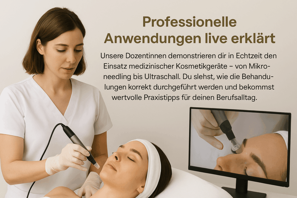 Unsere Dozentinnen demonstrieren dir in Echtzeit den Einsatz medizinischer Kosmetikgeräte – von Mikroneedling bis Ultraschall. Du siehst, wie die Behandlungen korrekt durchgeführt werden und bekommst wertvolle Praxistipps für deinen Berufsalltag.