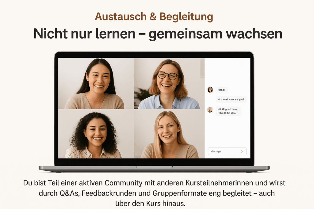 In unserer Ausbildung bist du nicht allein: Du lernst gemeinsam mit anderen engagierten Teilnehmerinnen in einer unterstützenden Community. Durch Live-Q&As, Gruppenformate und persönliches Feedback bleibst du stets im Austausch – motivierend, verbindend und auf Augenhöhe.